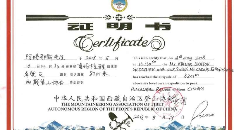 Атанас Скатов показа Сертификата за изкачване на Чо Ойю