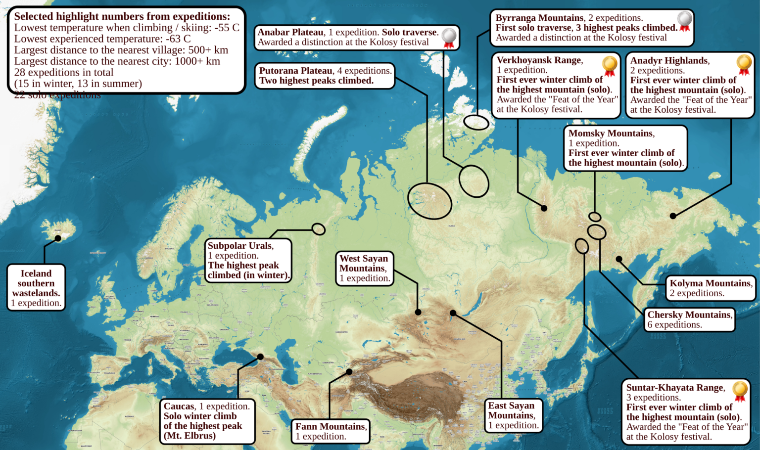 Сред целите му са най-високите върхове в планините Черски, Верхоянския хребет, Сунтар-Хаята, Момския масив, Анабар и планините край Анадир. Той изкачва и връх Мус-Хая – най-високата точка на Сунтар-Хаята – в близост до Оймякон, едно от най-студените постоянно населени места на планетата.