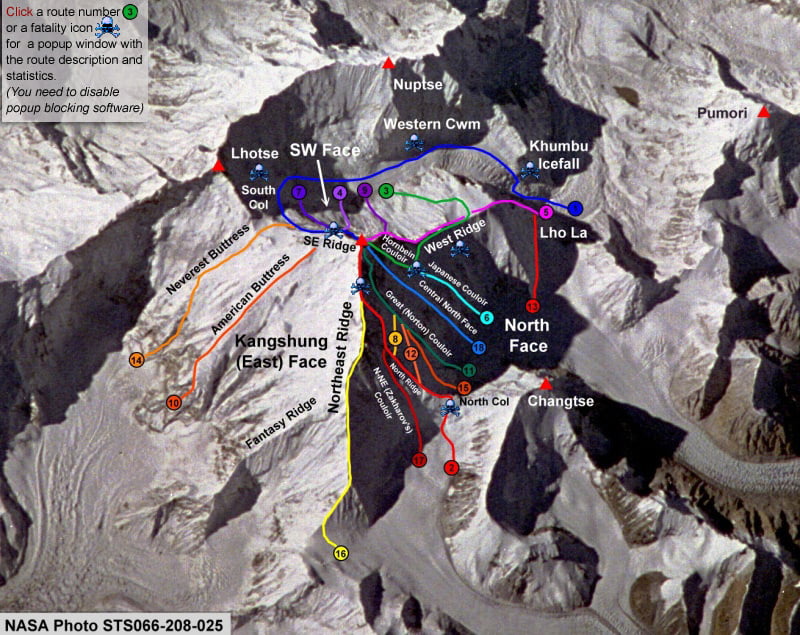 Маршрутите, използвани от комерсиалните експедиции, обикновено се ограничават през Южното седло (маршрут 1) или по класическия маршрут на Мелъри през Северното седло – Североизточен ръб (маршрут 2).