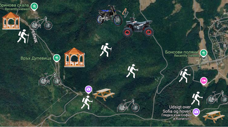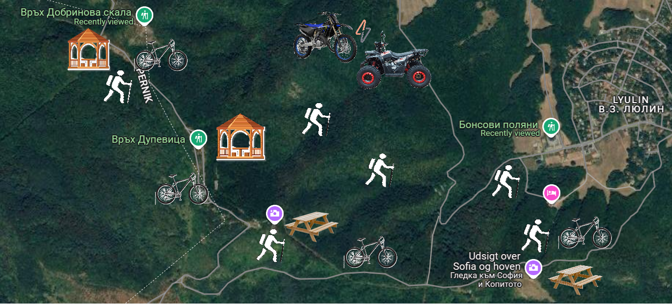 Да се възстанови и изгради напълно туристическата маркировка, да се поставят информационни табели за флората и фауната на района, да се облагороди инфраструктурата (пейки, беседки, места за отдих) към връх Дупевица, Добринова скала, Кърлежа, Горнобанския манастир „Св.св. Кирил и Методий“, Параклис “Вси Светии”, пътеките към кв. Княжево, с. Владая, гр. Банкя и други места с хубави гледки и растителност, подходящи за пикник и отдих включва проекто-намрението.