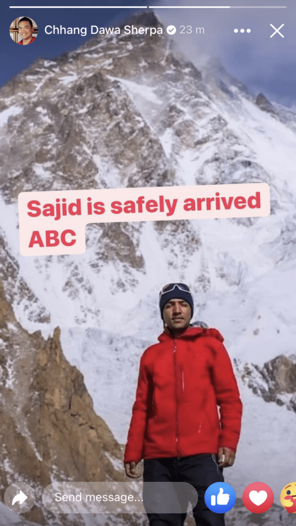 Саджид Садпара вече е в Преден базов лагер, съобщи Чанг Дава Шерпа, съсобственик на Seven Summit Treks.