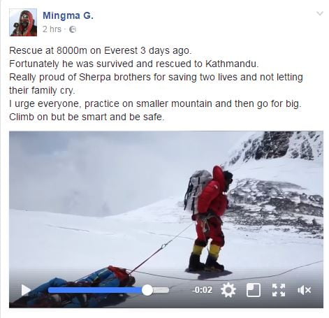 Управляващият директор на трекинг агенцията DREAMERS’ DESTINATION Мингма Джи Шерпа днес публикува няколко секунди видеозапис от спасителна операция на височина над 8000 м. по склоновете на Еверест. Ето какво написа той: