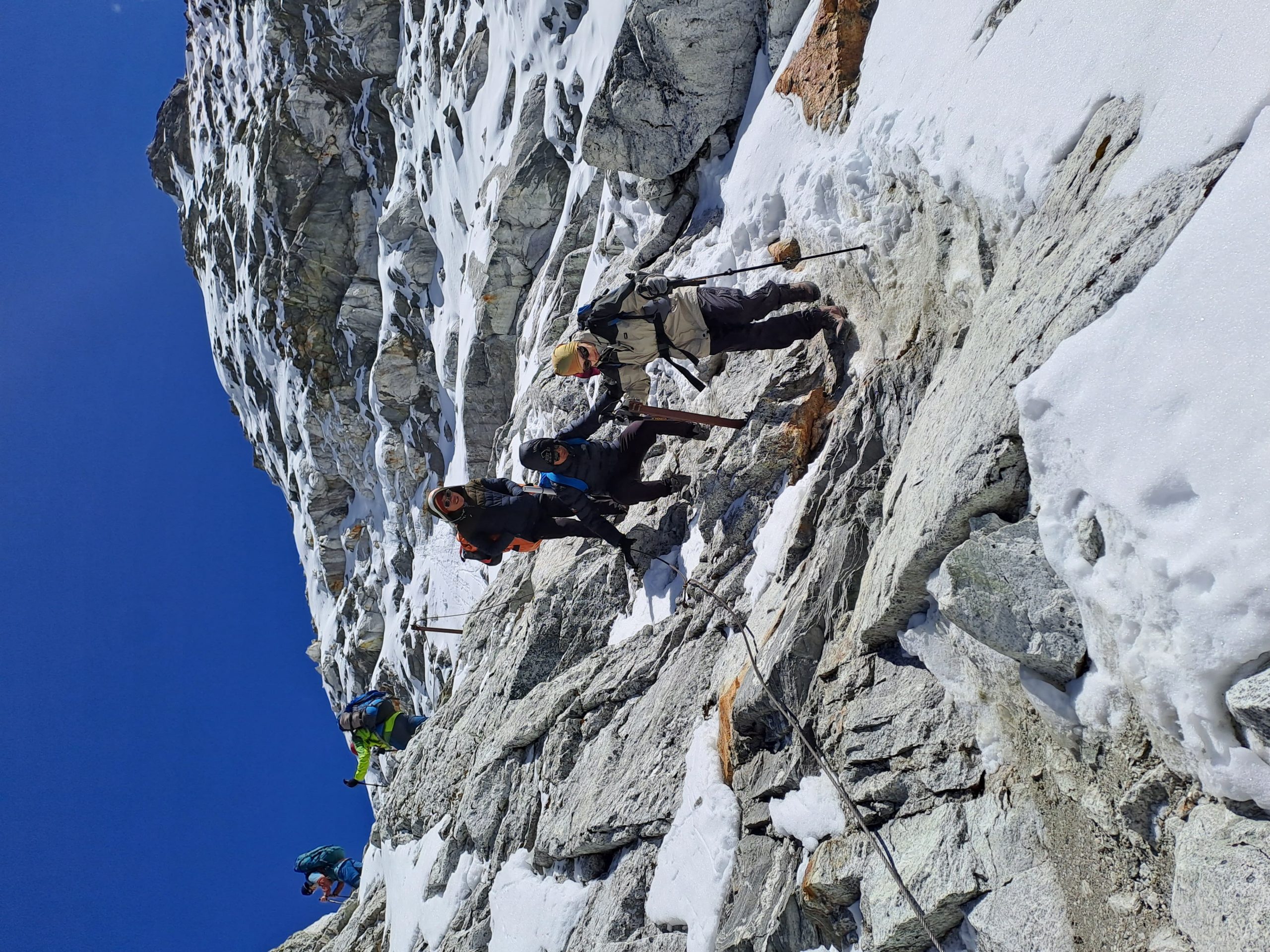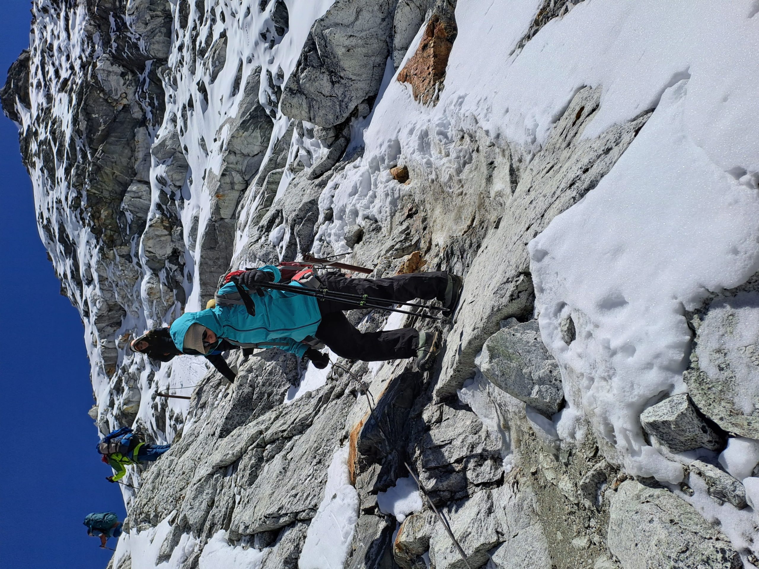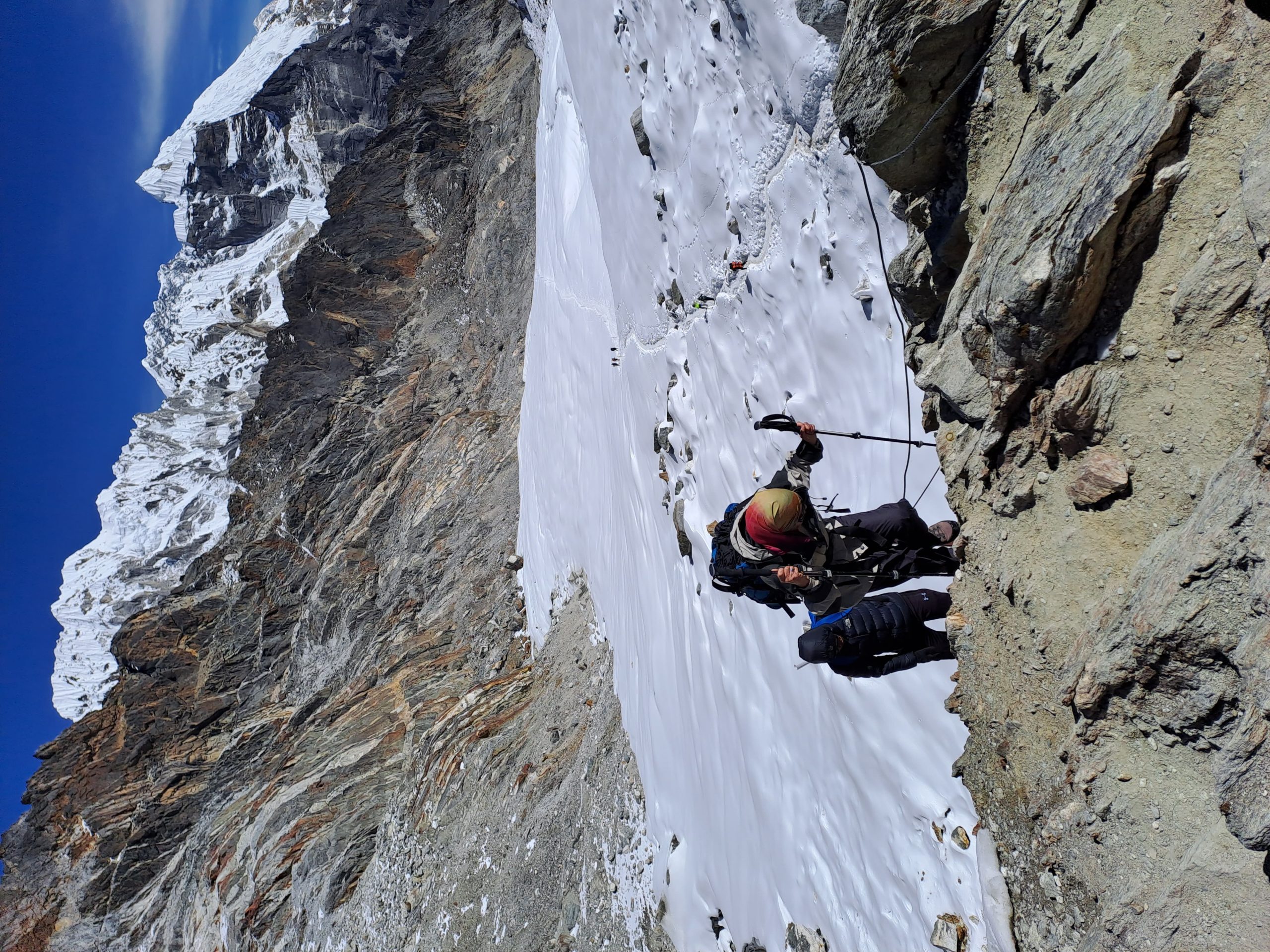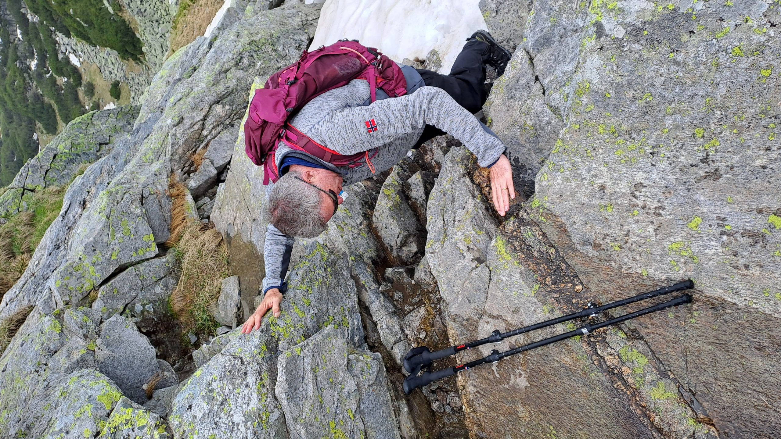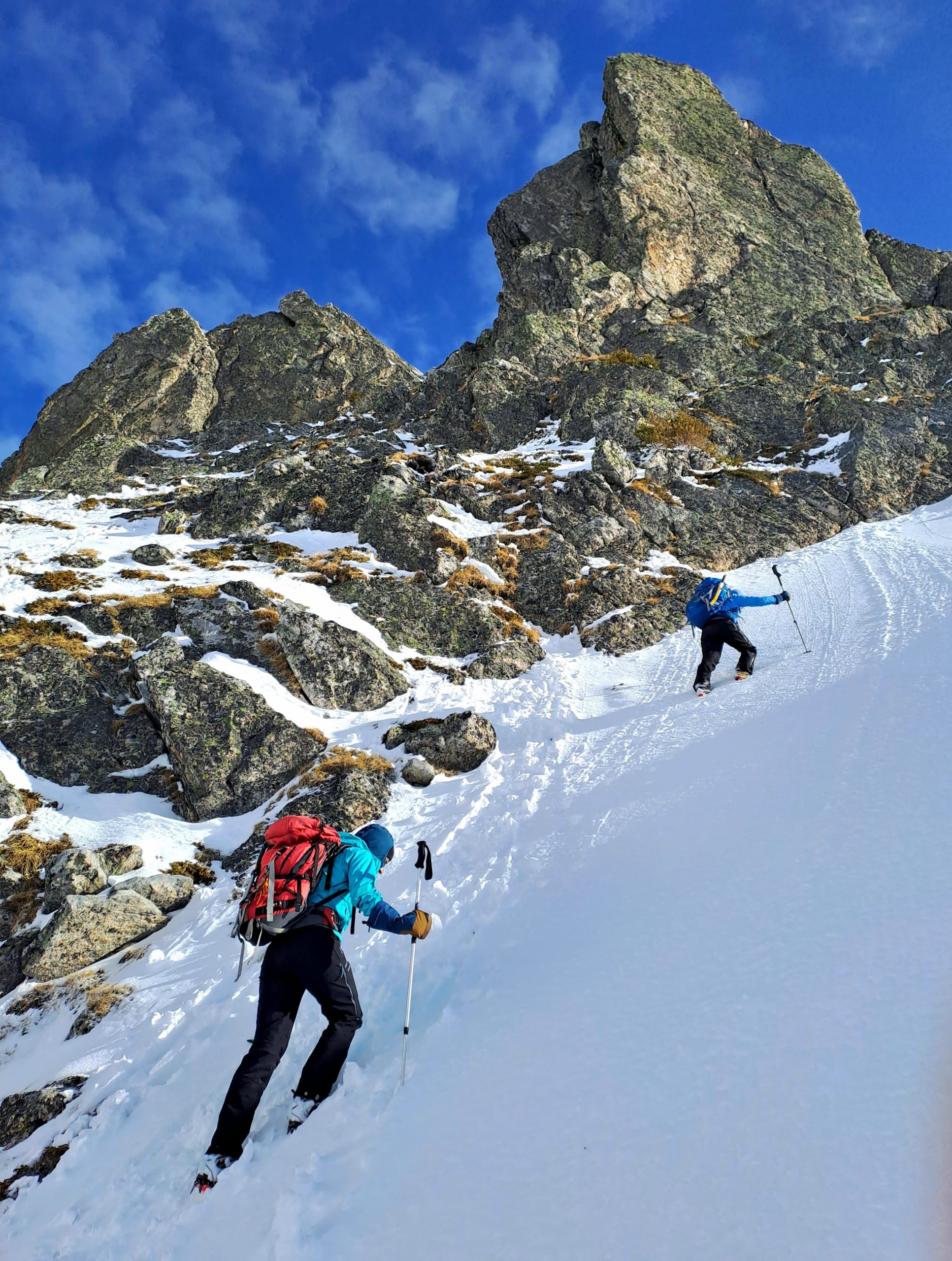 През зимата, щом сме стигнали до такъв склон, прибирайки щеките, би трябвало да извадим пикела, ако имаме такъв. Пикела има няколко функции през зимата – да се подпираме на него, да използваме клюна за закачане за скала или за забиване в туфа, фирн, лед и последна, която е много важна, като най-добре да не се стига до нея – самозадържане по стръмен фирнов или леден склон. Въпрос на много точна лична преценка е кога щеките да бъдат сменени с пикел, но щом има възможност от падане по стръмен хлъзгав склон, червената лампичка трябва да светне, колкото и да се чувстваме уверени при движението си.