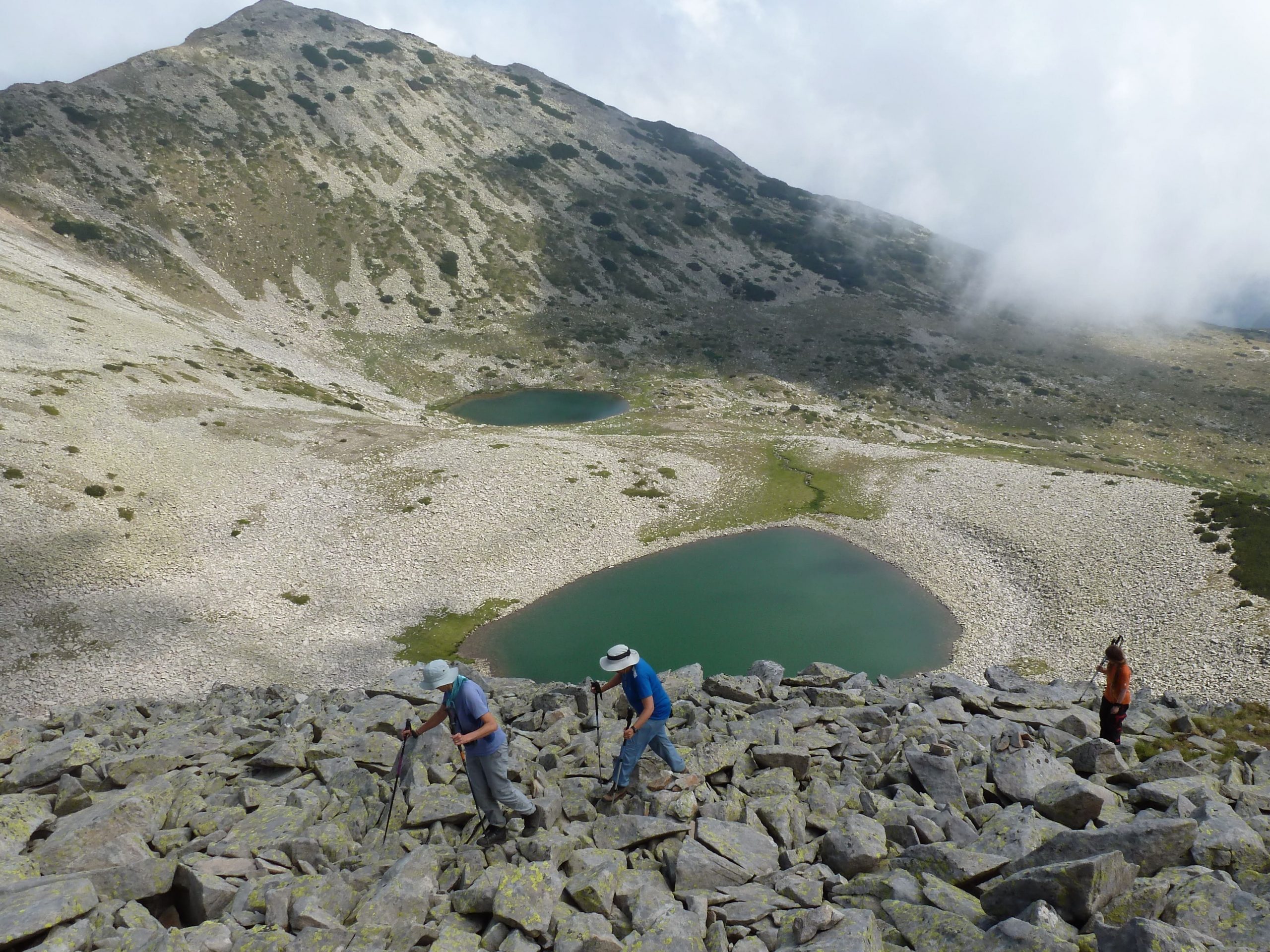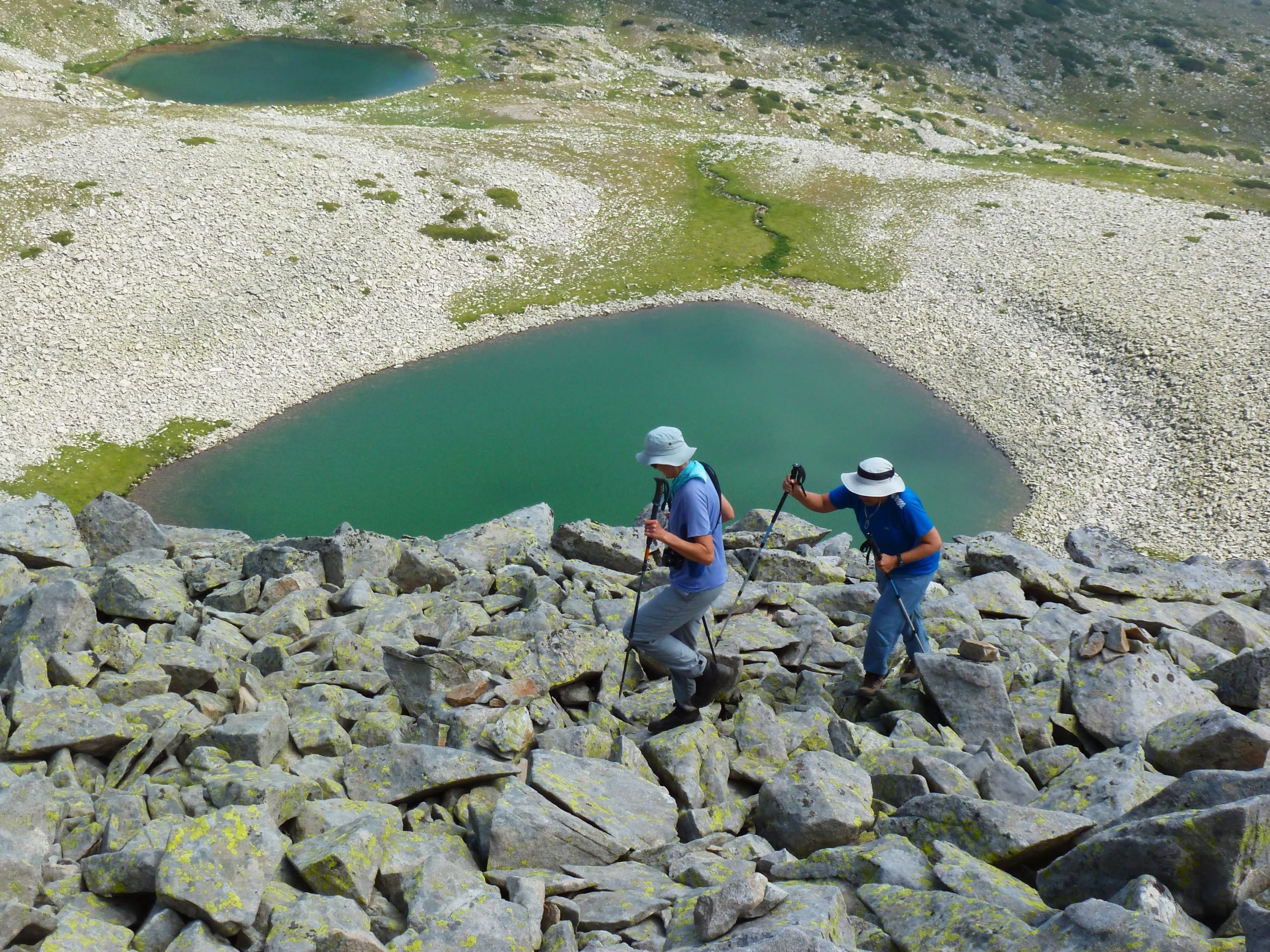 Ще започна със слизането, защото както споменах, това е от най-изтъкваните причини за употребата им в планината. За целта щеките трябва да са сравнително дълги. Висок съм около 1,75 м. и ако трябва да си наглася щеките за (дълго) слизане по стръмен склон, ще ги направя 1,35 – 140 м. (нормално ги ползвам с дължина 1,25 м). Защо дълго – не бих се занимавал да променям дължината за 50-100 м. денивелация. Губи се време, по-скоро бих ги ползвал, както са си. При слизане, щеката се поставят пред нас по склона. Ръката е отворена в лакътя. Слизайки, я сгъваме и поемаме с нея част от натоварването, което иначе отива изцяло в краката. Освен, че се облекчават мускулите на краката, слизането става плавно, което щади ставите – глезени, колена, таз и гръбнак. Особено помагат при преодоляването на високи „стъпала“, където най-вече се получава характерното „тръскане“, товарещо ставите. Много е важно щеките да са здраво затегнати, защото ако някоя се свие рязко при натоварването, изтъркулването по-надолу по склона е гарантирано.
