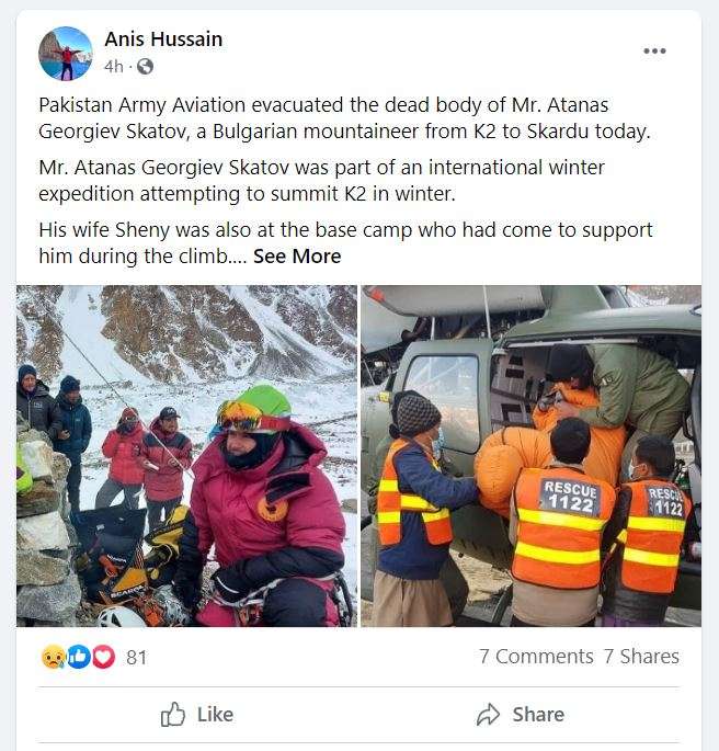 „Бяхме се объркали, защото GPS-ът му показваше, че е на голяма височина, след като се е откачил от алпиниста при падането. Но един от шерпите предположи, че е паднал по-ниско. GPS-ът показваше, че е на около 7000 метра височина. С хеликоптера са проверили по-ниско и са намерили тялото му на височина от почти 5500 метра. Паднал е почти два километра надолу”, обясни Танешар Гурагай, от Seven Summit Treks.