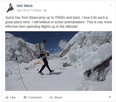 “Бърз ден от Базовия лагер до 7000 м и обратно. Обичам това, страхотно място е тук. Все още вярвам в активната аклиматизация. Това е много по-ефективно, отколкото нощувките на голяма височина!,” е написал алпинистът в последния си фейсбук пост от 26 април. Два дни по-рано той пише, че Тенджи има измръзвания, но вече се оправя.