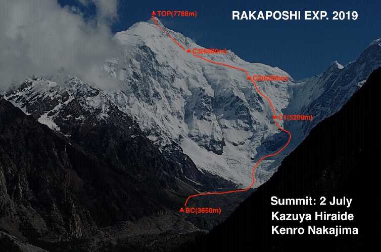 ⇒Премиерното изкачване на японските алпинисти Кацуя Хирайде и Кенро Накаджима по новия маршрут на връх Ракапоши (7788 м). Този връх е разположен в пакистанската долина Хунза (регион Гилгит-Балтистан).